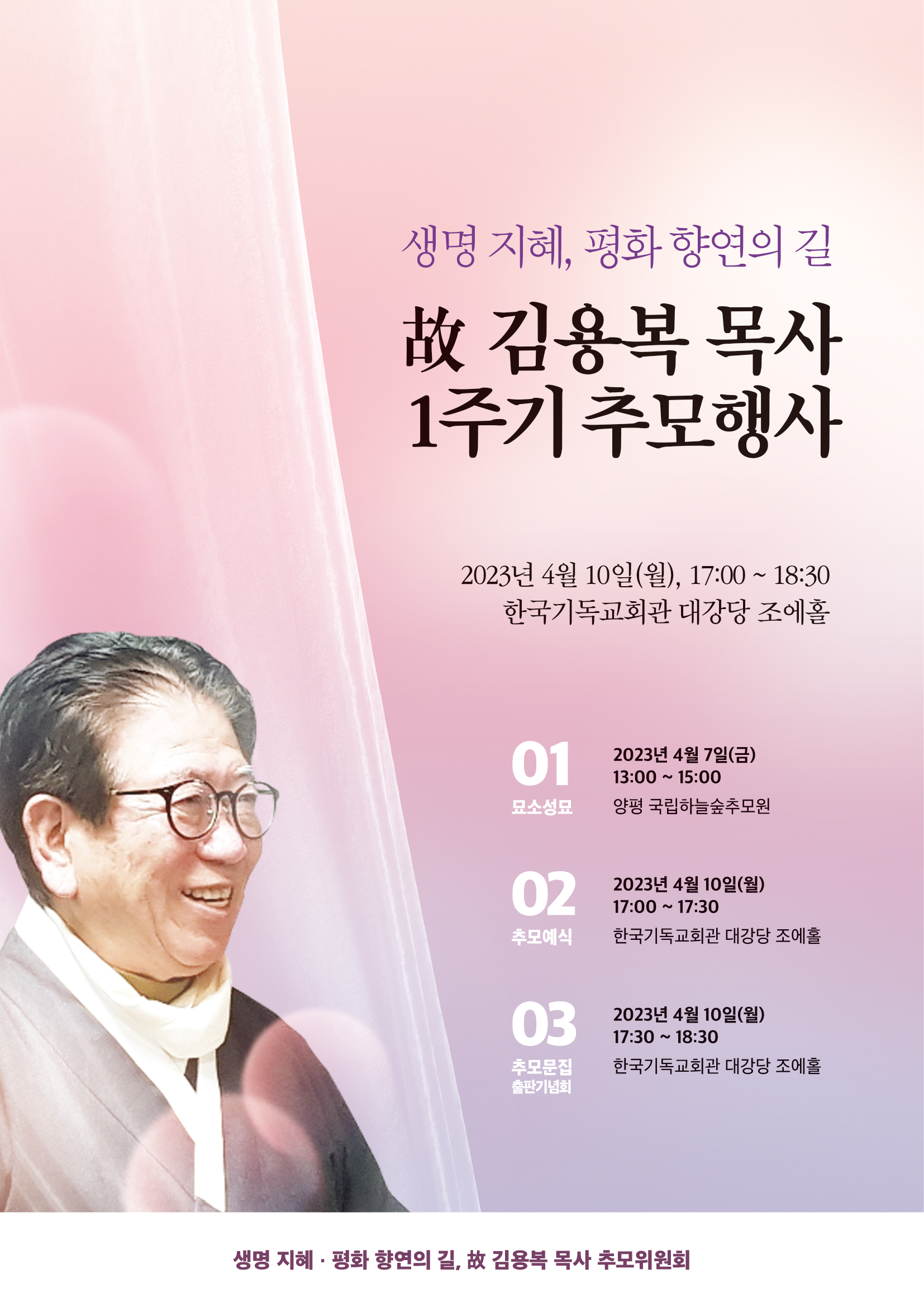 박사님의 추도식 1주기 일정표가 있습니다. 김용복. 2023년 03월 21일 by issue 한반도와 팔레스타인 사람들은 동서아시아 평화를 위한 연대의 비전을 시작했습니다. #김용복 박사 주기 #1 #기념물 일정을 알려드립니다. (2022년 故 김용복 박사 추모영상 시청) https://youtu.be/wgNsVmemUEY (2022 故 김용복 박사 추모 컬렉션 보기) https://goyangymca.org/main/ebook/78?page=3 고양YMCA '추천 관련글, 2023년 14회 면민 1일차노니의 10가지 이점과 부작용 목록노니의 10가지 이점과 부작용 목록고혼진화장품 가격할인 “생명의 정원, 평화의 터전을 가꾸는 평화의 사람들” www.goyangymca.org (2022 김용복 박사 추모식 및 생명축제) 故 박 목사 추도식 김용복 https://youtu.be/3e6-PItBIKc