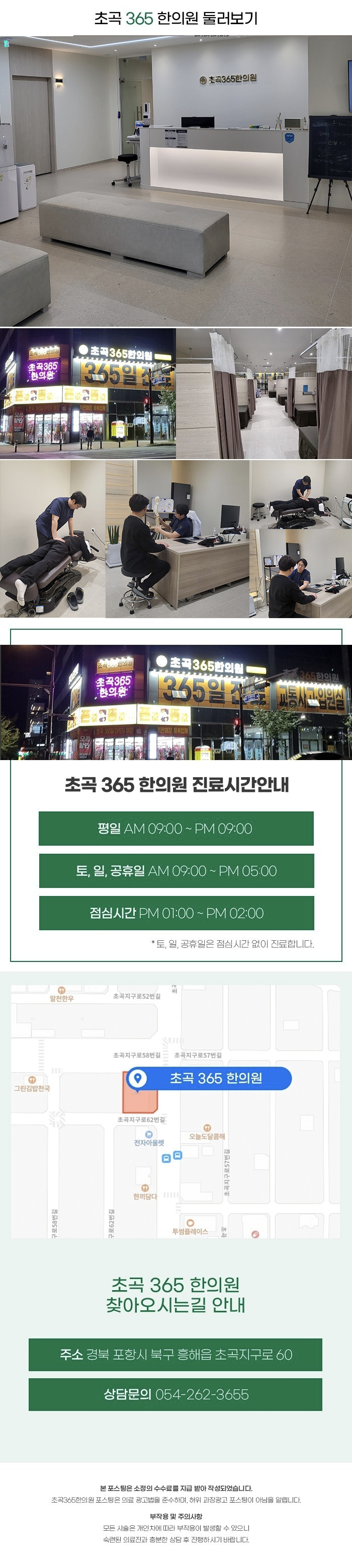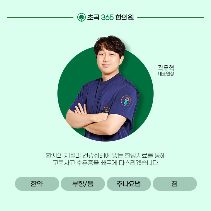 초곡365한의원에서는 기의 흐름을 방해하는 혈전을 제거하고 그로 인한 통증을 치료하는데 중점을 두고 있습니다. 모든 한방치료는 개인의 체질과 건강상태, 병의 경과를 고려하여 이루어지므로 최적의 효과를 기대할 수 있습니다.
