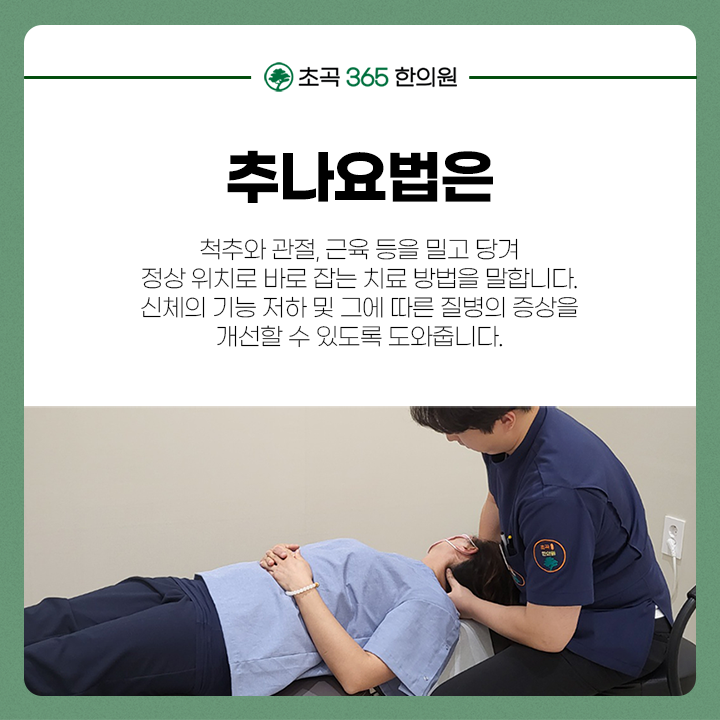 교통사고 후 경추나 척추의 손상이 있거나, 골반이 휜 경우에는 이를 추나요법으로 교정하는 것이 필요합니다. 추나요법은 한의사가 직접 척추의 정렬을 교정하고 근육을 밀고 당기며 부드럽게 풀어주는 도수요법입니다. 이것은 신체의 불균형을 제거하여 통증을 줄일 수 있습니다. 디스크 질환이나 각종 근육통을 완화할 수 있습니다.